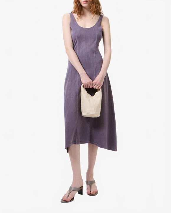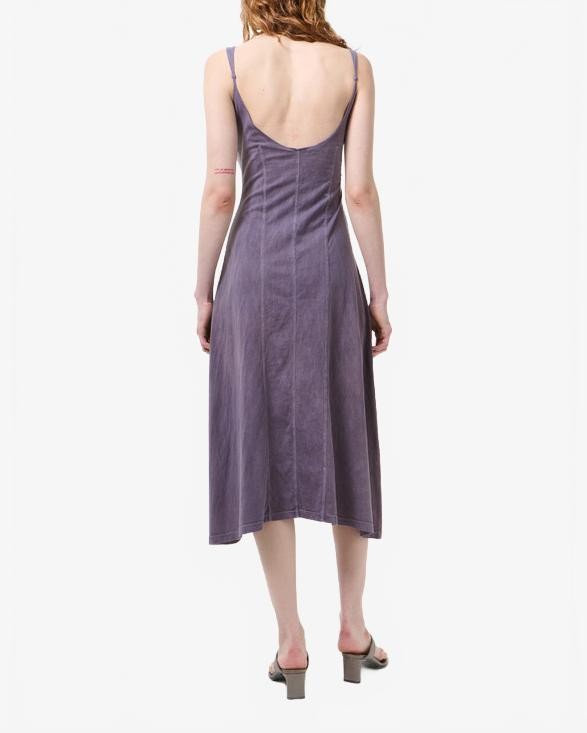 Fitted at chest and waist with trapeze skirt. Low neckline front and back, coverstitched front and back darts and flatlock center back seam. Back strap detail with buckle forming a small triangular shape.