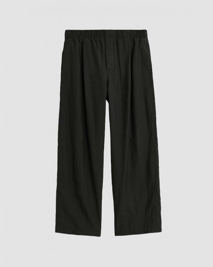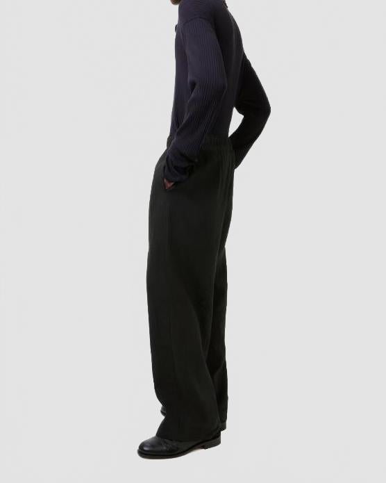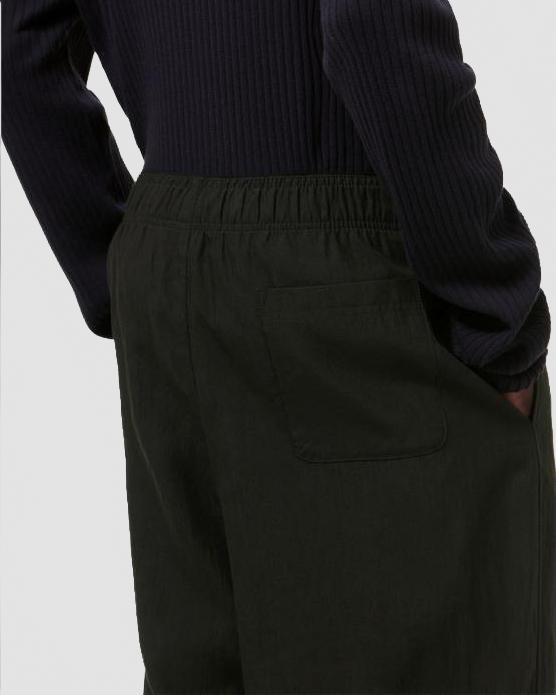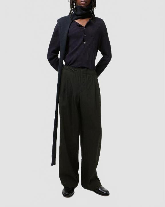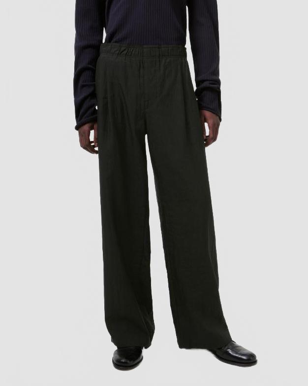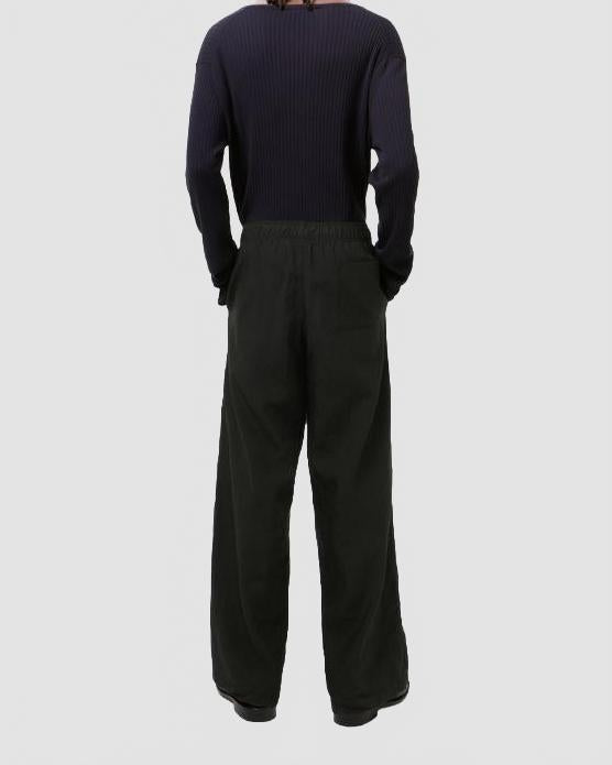 Coupe et style : coupe relax à jambe large pour un porté décontracté. Taille élastiquée et ceinture plissée apportent confort et tenue, la braguette cachée et les boutons corozo soignent les détails. Le modèle mesure 186 cm et porte la taille 48.