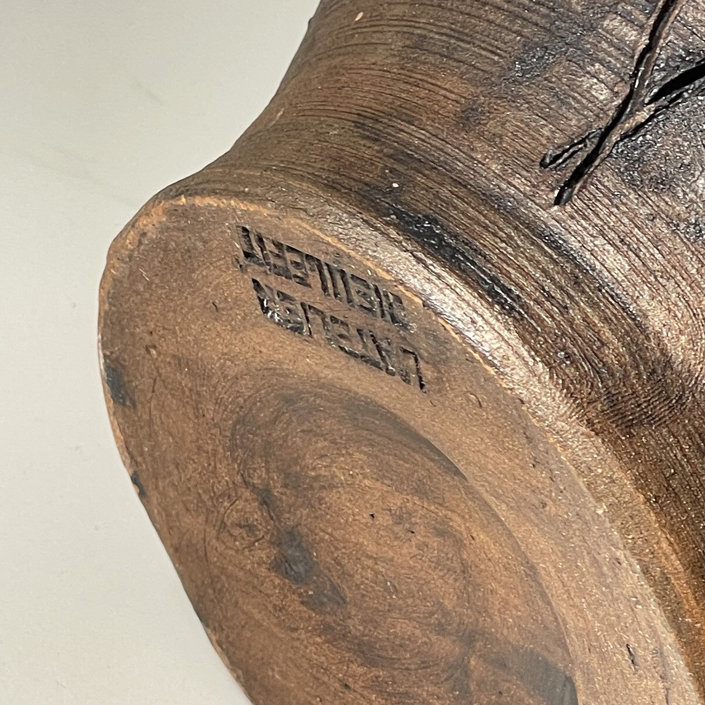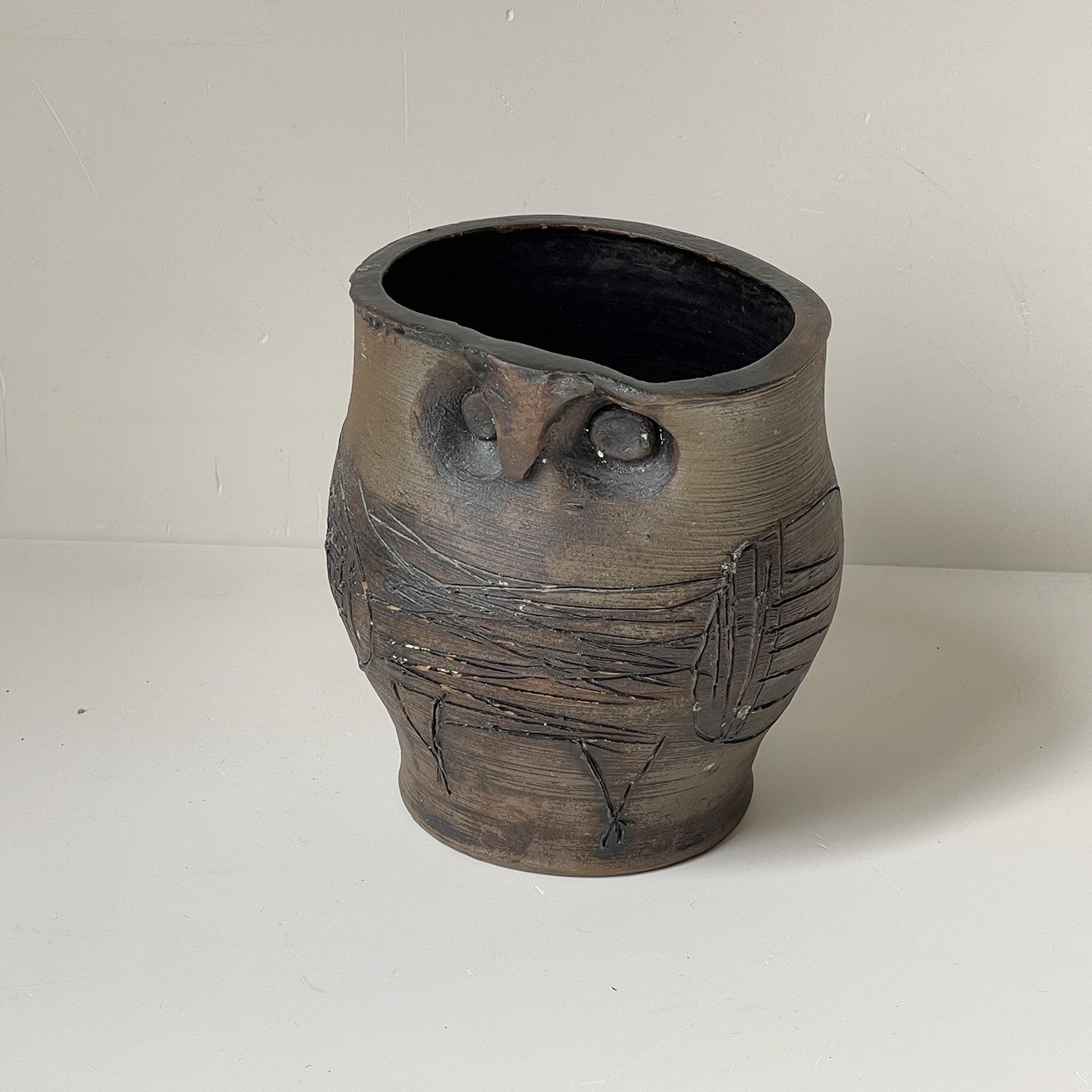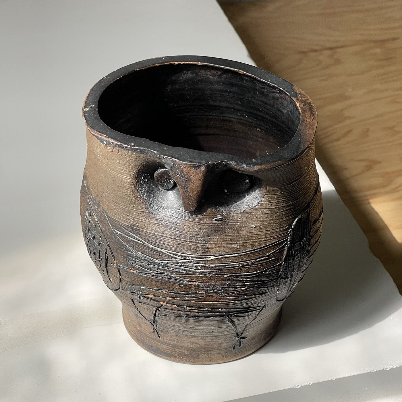 Sculpture en terre chamottée à décor incisé, intérieur émaillé noir
